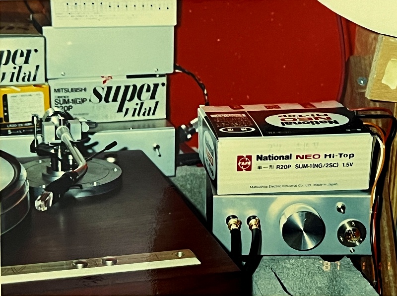 ・下の写真は自作オーディオで、マイクロのレコードプレーヤー、デンオン DL-103 MCカートリッジ→金田式自作フォノイコライザー&プリアンプ(金田式電池駆動)→自作パワーアンプ(金田式電池駆動)→エアバッフルのスピーカー(コーラルの20cmフルレンジ使用)