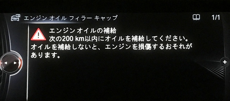 ところである日、走行中に「エンジンオイルの補給:次の 200 km 以内に オイルを補給してください 。」というウォーニングが出ました。